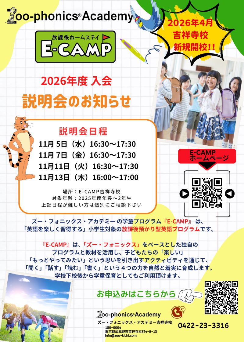 ズー・フォニックス・アカデミー吉祥寺校では、2026年4月に『E-CAMP吉祥寺校』を新規開校します!🎉