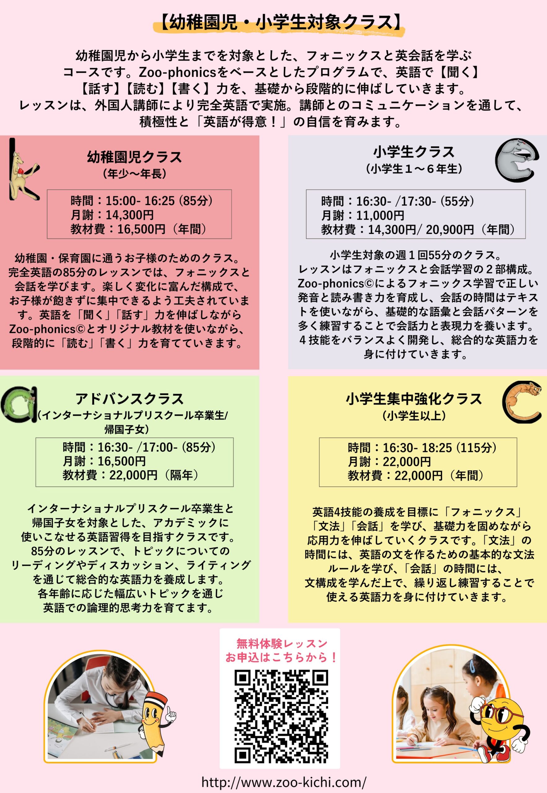 お子様に英語に触れてほしい、フォニックスを一からしっかり学ばせたい、楽しく英語を身に付けられるスクールを探しているなど、英語スクールにご興味をお持ちのお子様、保護者の皆様、ぜひこの機会にZoo-phonicsでのレッスンをご体験ください😊