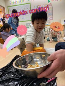 DDクラス(4-6歳)と皆で集まりpumpkin curvingをし、